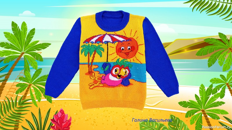 Дорогие рукодельницы! Вот уже и середина осени близко. И хотя еще на улице довольно тепло, но у нас уже включили отопление. А как хорошо было летом! Примерно вот так! Джемпер связан по мотивам старого доброго советского мультика про попугая Кешу. А небо желтое, потому что ЖАРКО! На самом деле долго прикидывала и так, и этак. Но как только делала небо обычного голубого цвета, сразу день становился пасмурным, и пропадало ощущение знойного летнего полдня. Рискнула! На мой взгляд, не прогадала. А на Ваш?