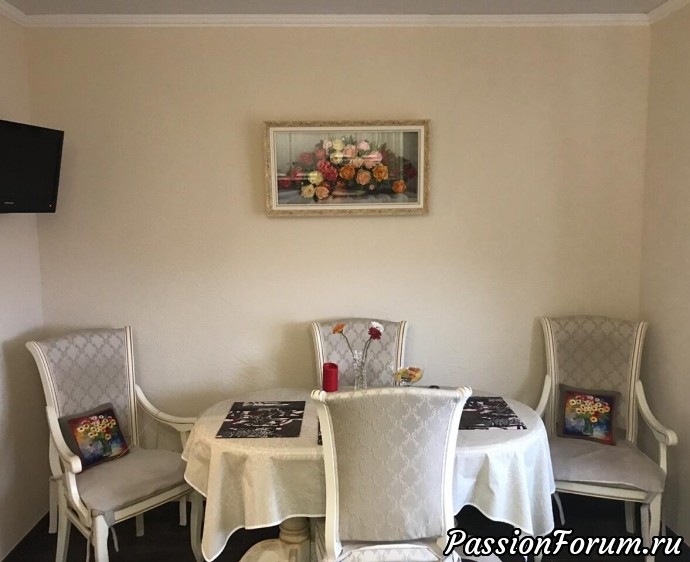 Недавно я выставляла картину вышитую для своей доченьки. Мне так хотелось её показать, это первая моя боьшая работа. В неё столько вложено труда, любви и воодушевления, что не терпелось поделиться...Она была даже ещё в упаковке))). Девочки мне написали: -А почему на кухне дочь хочет повесить?...И вот вчера свершилось))) ! Наконец-то ей опредилили место в уголке на кухне))) ,прямо над обеденным столом .Дочери и её семье понравилось, а я и рада!)))