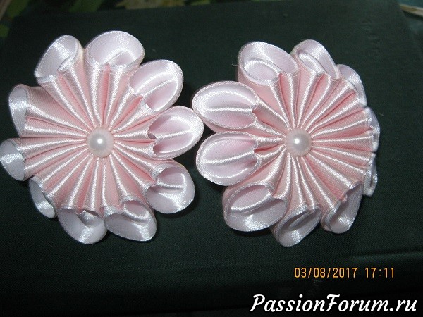 Впервые решила сделать в подарок бантики в технике канзаши. Использовала ленточки 2,5 см шириной двух цветов: белые внутри и розовые снаружи. Вот что получилось: Использовала МК: