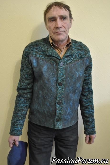 Этот жакет сделан давно, но никак не фотографировался. А тут уже на работу собираюсь, и выходит Мой в жакете, решил опробовать на холод, и как по заказу побритый, в штанах рабочих правда, но мы же не штаны разглядываем. В общем бросила собираться, схватила фотик и засняла, когда еще так звезды сложатся. Пробовала технику плетение. первый вариант получился маленький, помните я из него сделала внучке жакетик с рыбками. Увеличила шаблон, ну так ведь все равно уваляла до немогу. Но "голь на выдумки ...