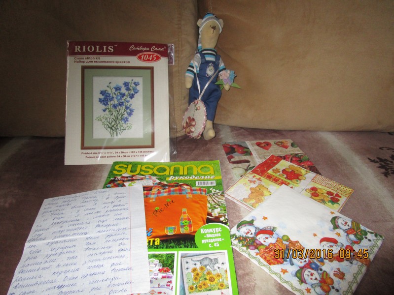 Здравствуйте, дорогие девочки. Пришло время и мне похвастатся с красивыми подарками. Вы не знаете как я всю неделю сдерживалась. Получилось вот так- 1 июля мы уехали в горы с мужем на неделю отдохнуть и через день дочка звонит и говорит - мама тебе приглашение на посылку принесли. А я в горах и приеду обратно через неделю. Каждый день думала, а что в посылке и еле дождалась. Сегодня после работы побежала на почту и вот отчет. Моей феюшкой стала Аушра из Литвы. Такие милые подарки. Я думаю она тщательно пос...