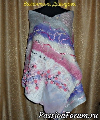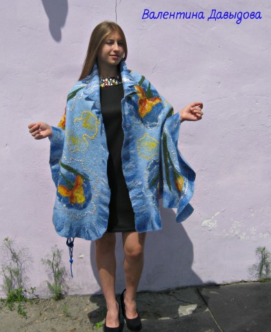 Пончо изготовлено из тонкой шерсти австралийского мериноса с использованием волокон вискозы.Пончо мягкое,тёплое,демисезонное.Цвет потрясающий! Внутренняя сторона полностью покрыта волокнами вискозы.По желанию заказчицы были изготовлены шарфик к нему и брошь-цветок.Пончо валялось в два слоя паркетной раскладкой.Изготовлю на заказ.