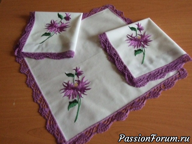 Салфетки выполнены из белого льна.Ручная вышивка гладью,края и поле салфеток украшены мережкой.Стоимость 1 салфетки- 700 руб.,в наличии 2 салфетки.Салфетки можно купить вместе с дорожкой (см. фото).Стоимость дорожки 1700 руб,стоимость комплекта 3100 руб.Размер салфеток 41х42 см,дорожки-104х48 см.Оплата наличными при личной встрече на ст. метро,стоимость доставки 100 руб.Тел.89164023191.