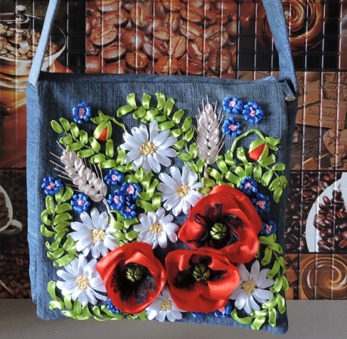 Мои первые стежки . Сумочка размером 20 на 22 глубина 5 . Сшита из джинсовой ткани и вышита атласными лентами . Сумочка имеет карман на молнии сзади для ключей или мелочей , внутри карман для мобильного телефона , сверху закрывается на молнию и за стягивается на клёпку которую не видно .