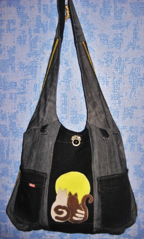 Сегодня дошила сумку из джинсов. И хотя у кого-то в комментариях я прочитала слова одной мастерицы, что старые джинсы, есть старые и из г...конфетку не сделаешь, я все же старалась, а что получилось- смотрите. Просто очень хотелось сделать сумку такой формы, с одной широкой длинной ручкой.Внутри подкладка, карман на молнии и застежка на липучке, ну и любимая моя аппликация.