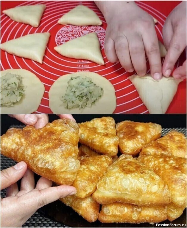 В каждую лепешку выкладываем начинку, запечатываем в форме треугольника.
