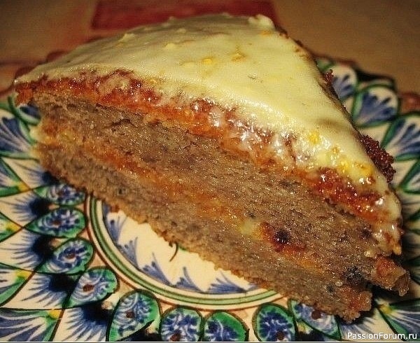 5. Половину крема выложить на первый корж, закрыть его вторым коржом. Верх пирога залить оставшейся половиной крема.
