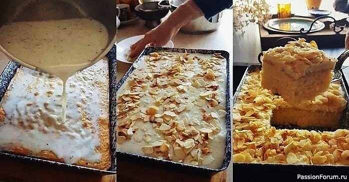 Вылейте горячий крем на влажный пирог дайте остыть. На сухой сковороде поджарьте миндальные хлопья до легкого коричневого оттенка и посыпьте ими пирог.