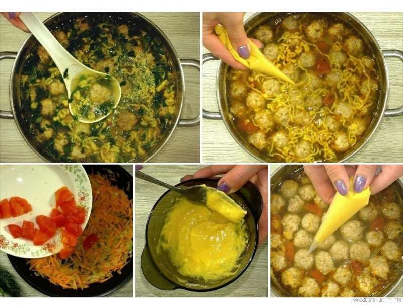 Выдавливаем лапшу в кипящий бульон (если мешают например фрикадельки, раздвиньте их ложкой, ТОЛЬКО В КИПЯЩИЙ БУЛЬОН).