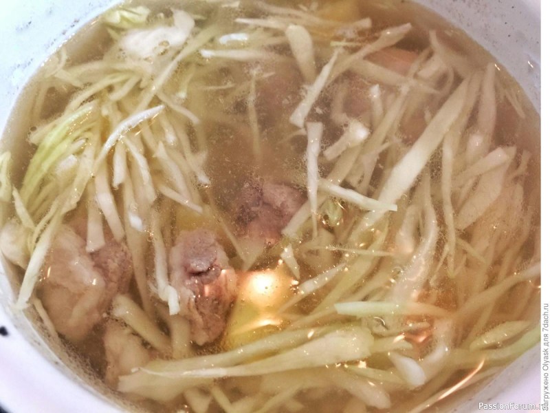 Почти готово 5. Пока зажарка тушится, в бульон добавляем тонко нашинкованную капусту, и картошку, порезанную крупными кубиками. Варим еще 15-20 минут и добавляем нашу зажарку, специи по вкусу