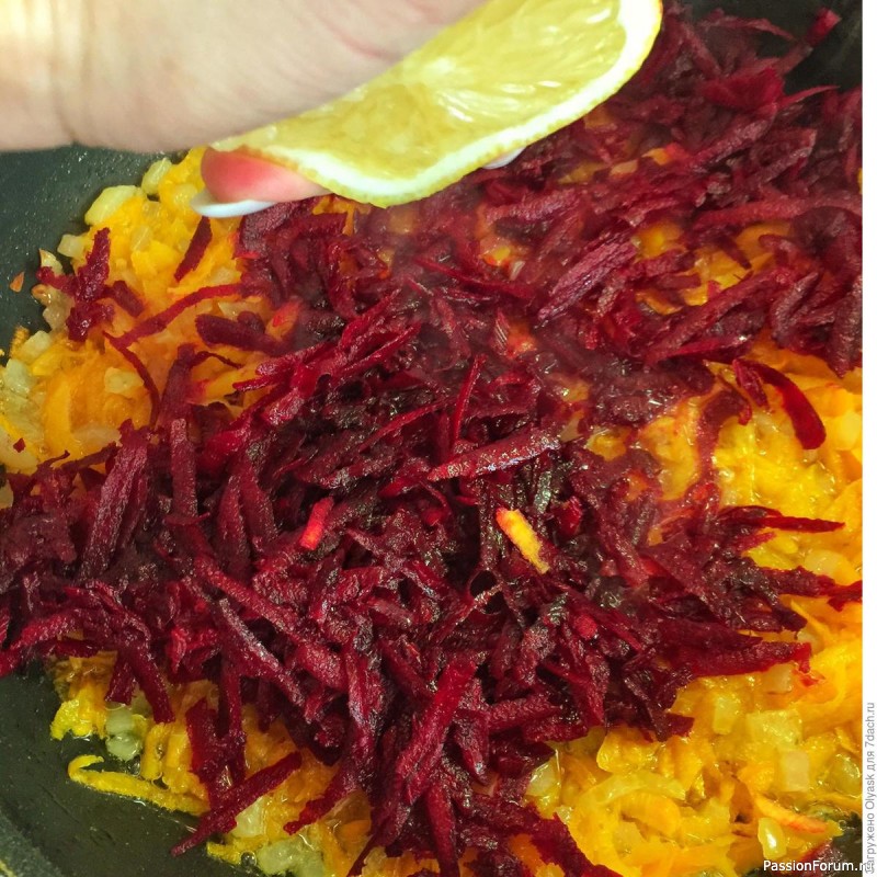 Заправка 3. Следующий процесс: обжарка овощей. Сначала обжариваем лук – 1 минуту, потом добавляем к нему морковь – обжариваем еще 3 минутки, в последнюю очередь добавляем свеклу, взбрызгиваем ее лимонным соком и держим на огне еще 2-3 минутки.СОВЕТ: Важно соблюдать очередность обжарки ингредиентов (лук, морковь, свекла). Это связано с тем, что каждому из продуктов нужно определенное время термической обработки.