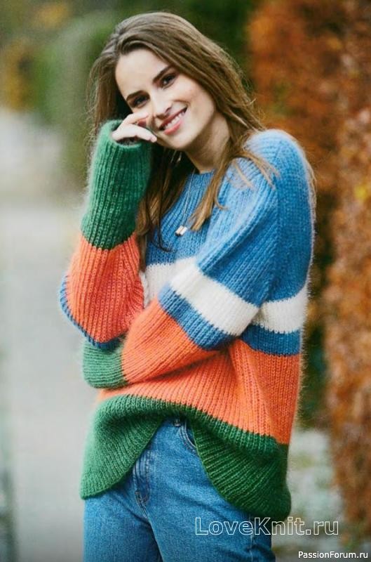 Зеленый, оранжевый, синий и белый — многоцветное сочетание горизонтальных полос разной ширины сразу привлекает внимание. Очень яркий и заметный пуловер связан полупатентной резинкой в две нити из двух видов прекрасной пряжи: одна состоит из мохера с шелком, вторая из шерсти мериноса с хлопком. Размеры: S (М) L (XL)