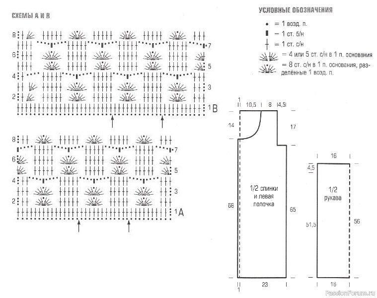 РУКАВА: связать цепочку из 61 возд. п. + 3 возд. п. подъёма. Вязать смещённым узором из раковин А. причём 1-й ст. с/н выполнить в 5-ю от крючка возд. п. = 5 раковин во 2-м р. Через 51,5 см = 46 р. от начала работы сделать с обеих сторон отметки. Через 4,5 см = 4 р. от отметок закончить работу.