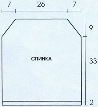 Спинка: набрать 132 п. и связать 12 р. двойной резинкой и 2 р. лиц. гладью, равномерно убавив в 1-м р. 1 х 66 п. и во 2-м р. 1 х 12 п. (= 54 п.). Далее вязать основным узором, через 35 см убавлять с обеих сторон в каждом 2-м р. 8 х 1 п. Через 44 см закрыть все оставшиеся петли.