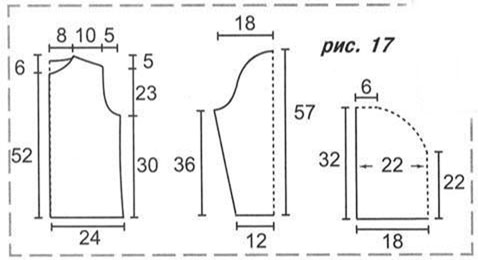 Перед началом работы сделайте качественную выкройку изделия в натуральную величину, корректируя по своим меркам (рис. 17). Далее выберите группу идентичных мотивов, на основе которых будут строиться мини-композиции (скрамбли). Каждый скрамбль представляет собой сочетание различных приемов вязания, что дает возможность получать новые варианты.
