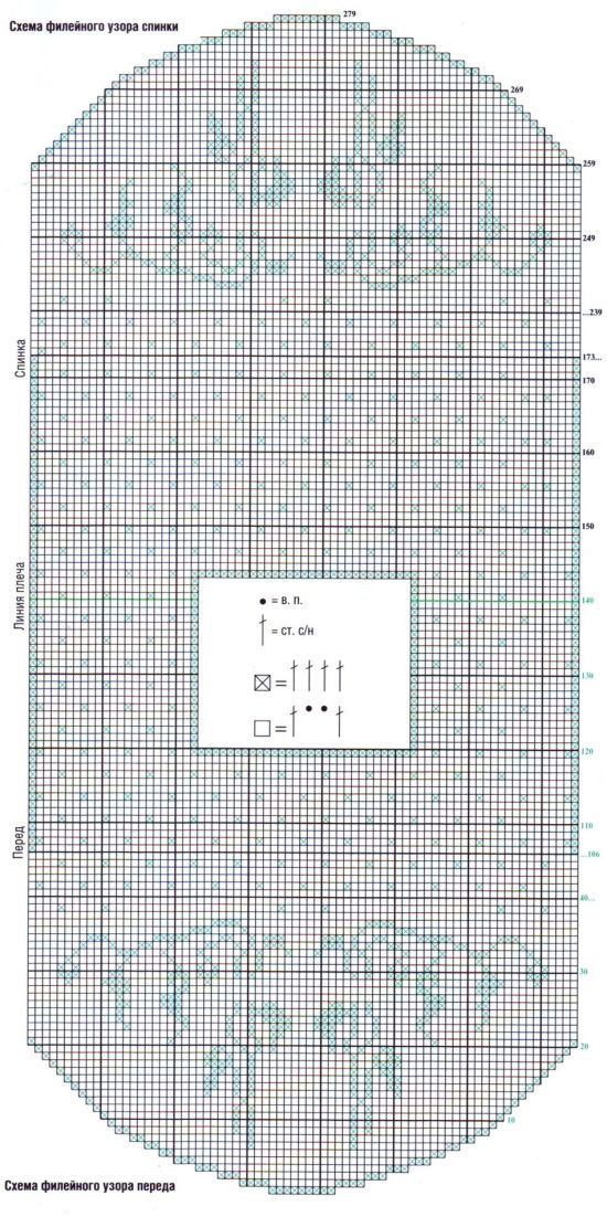 Для оформления линии горловины оставить непровязанными средние 29 филейных ячеек. В работе 23 филейные ячейки. Далее работу продолжить прямыми и обратными рядами согласно схеме филейного узора переда по 143-й ряд включительно. Нить не отрезать. Левое плечо выполнить аналогично. Нить левого плеча отрезать.