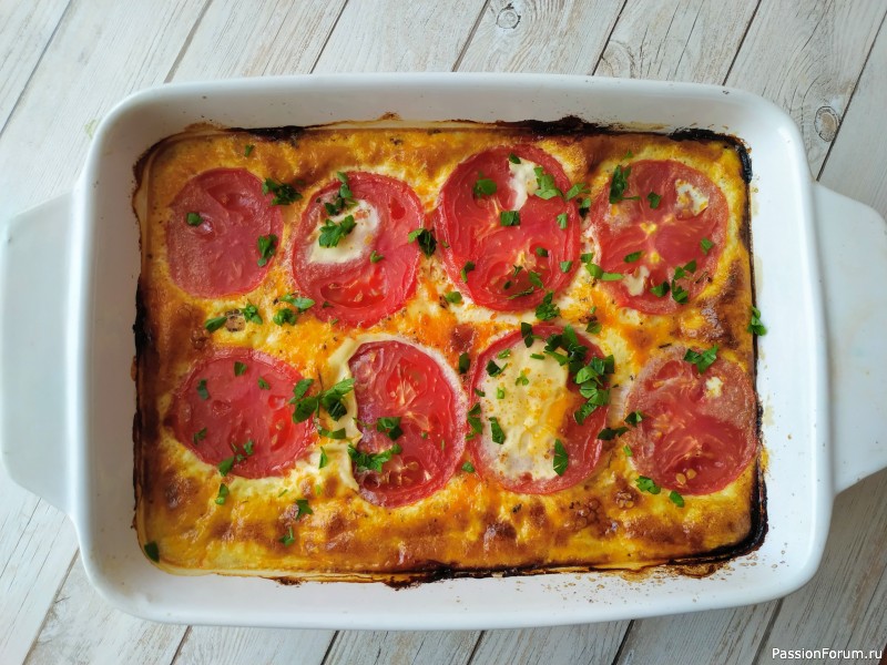 - 5.В форму для запекания выкладываем измельченное филе, заливаем яично-сливочной смесью и сверху выкладываем кружочки помидоров.