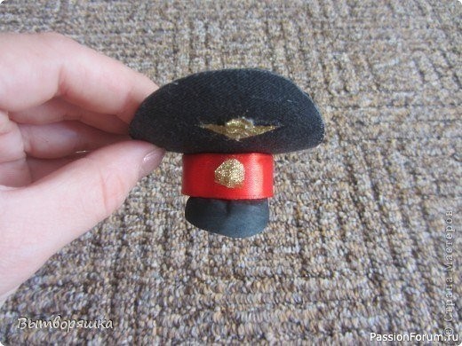 А это мой вариант. Для кантика взяла красную пряжу. Сначала хотела подклеить. Рисковать клеем Момент не стала - запачкает всю работу. Попробовала ПВА - тоже не очень, запачкала слегка, а приклеить нитку он и не подумал))). Тогда я просто прошила пряжу тонкой красной ниткой (типа мулине) по окружности. Для кокарды взяла форменную пуговицу с орлом. но у этой пуговицы большая крепкая ножка. Поэтому надо прорезать отверстие в ободке, вставить и закрепить внутри пуговицу. По линии козырька прикрепила золотой шнур. У настоящей фуражки шнур крепится на пуговицы. Я же просто завязала узелки, имитируя пуговицы и пришила шнур.