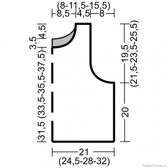 Через 15 (17–19–21) см = 34 (40–44–48) р. от начала формирования пройм закрыть для горловины средние 15 п. и сначала закончить левую сторону.