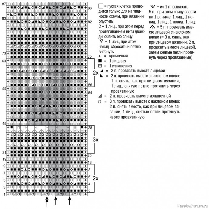 При выполнении ажурного узора следить за тем, чтобы количество накидов и провязанных вместе петель во внешних раппортах было одинаковым и средняя петля (= двойная стрелка на схеме) соответствовала середине детали.