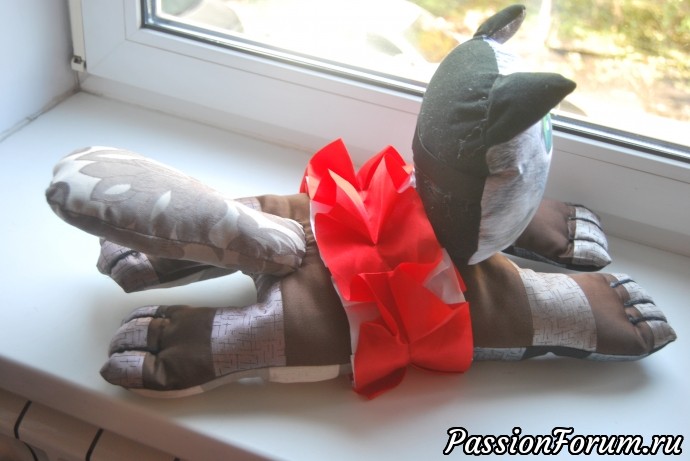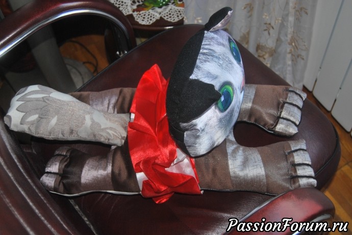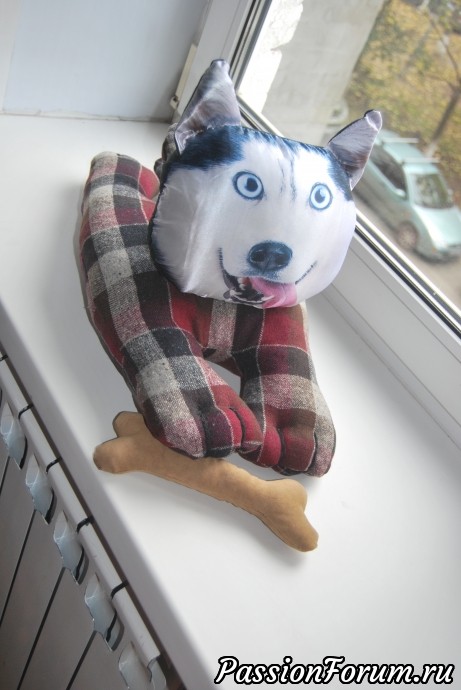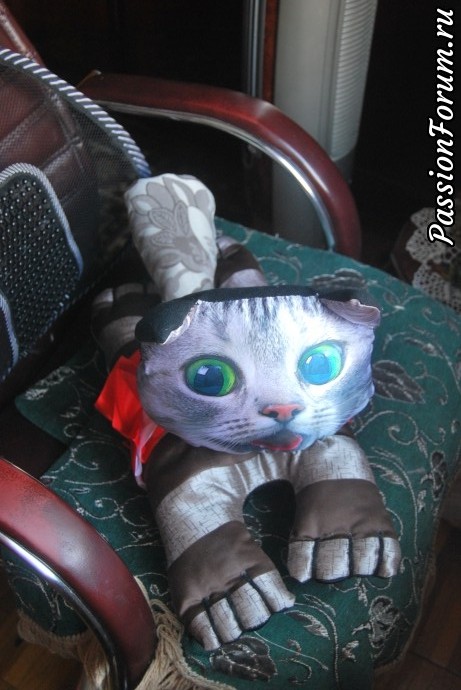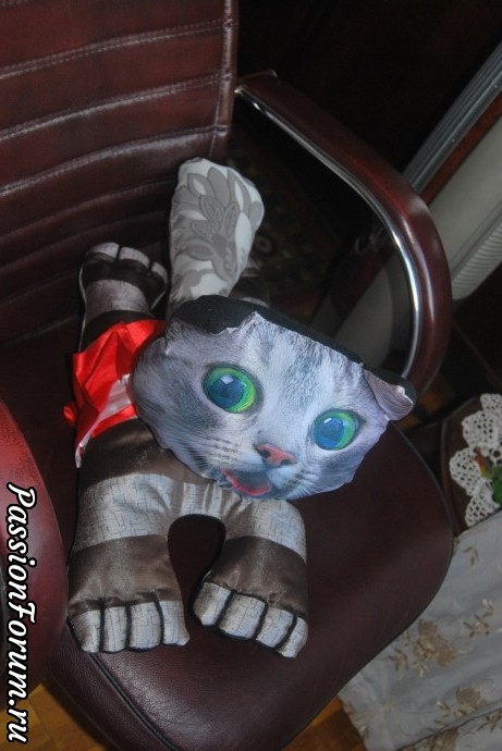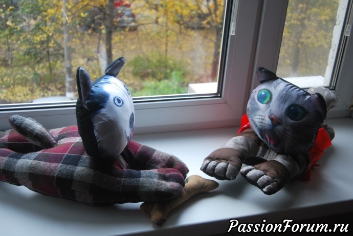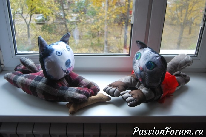 Учитывая тот факт,что творю я из того,что есть в доме-проект "утилизация припасов"-игрушки-подушки сшиты по этому принципу. Кошка сшита из кусочков обивочной ткани-ткань жесткая и сыпучая,в набивке непростая.Юбочка-часть свадебного украшения машины.Собака сшита из шерстяной "шотландки"-вначале это была роскошная подкладка у моего осеннего пальто(Таллинский Дом Моды "Люкс"!),потом-моя юбка(мама сшила) и вот собака.Теперь я поняла,почему у меня предыдущие игрушки морщили при набивке-все они были сшиты из жестких тканей.Работать с мягкой тканью одно удовольствие.Ну,учитывая отсутствие художественных талантов-головы из Фикс-Прайса.