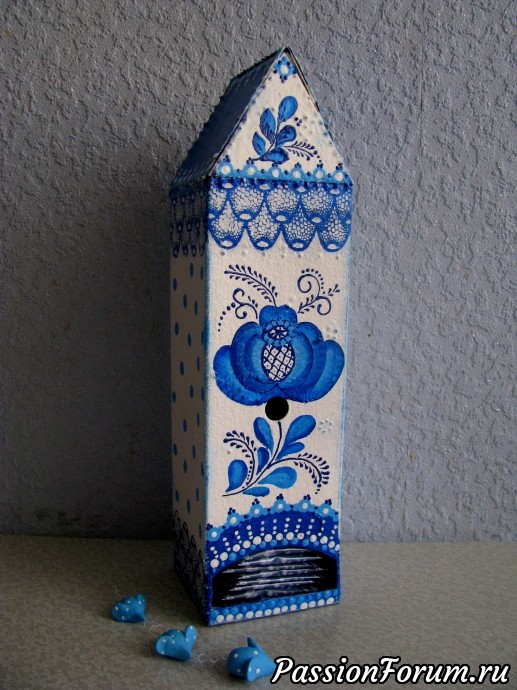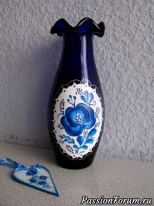 Люблю цветы, синий цвет и гжель. Вышила картину, сделала часы и оформила бутылку. Декупаж, роспись акриловыми красками. Заодно и чайный домик, и разделочные доски, и старая стеклянная ваза со страшной наклейкой подверглись декору, сделала вешалку для кухни, но не прикрутила еще крючки, можно и чашечки, и полотенце и прихватки повесить. И вот, что получилось.