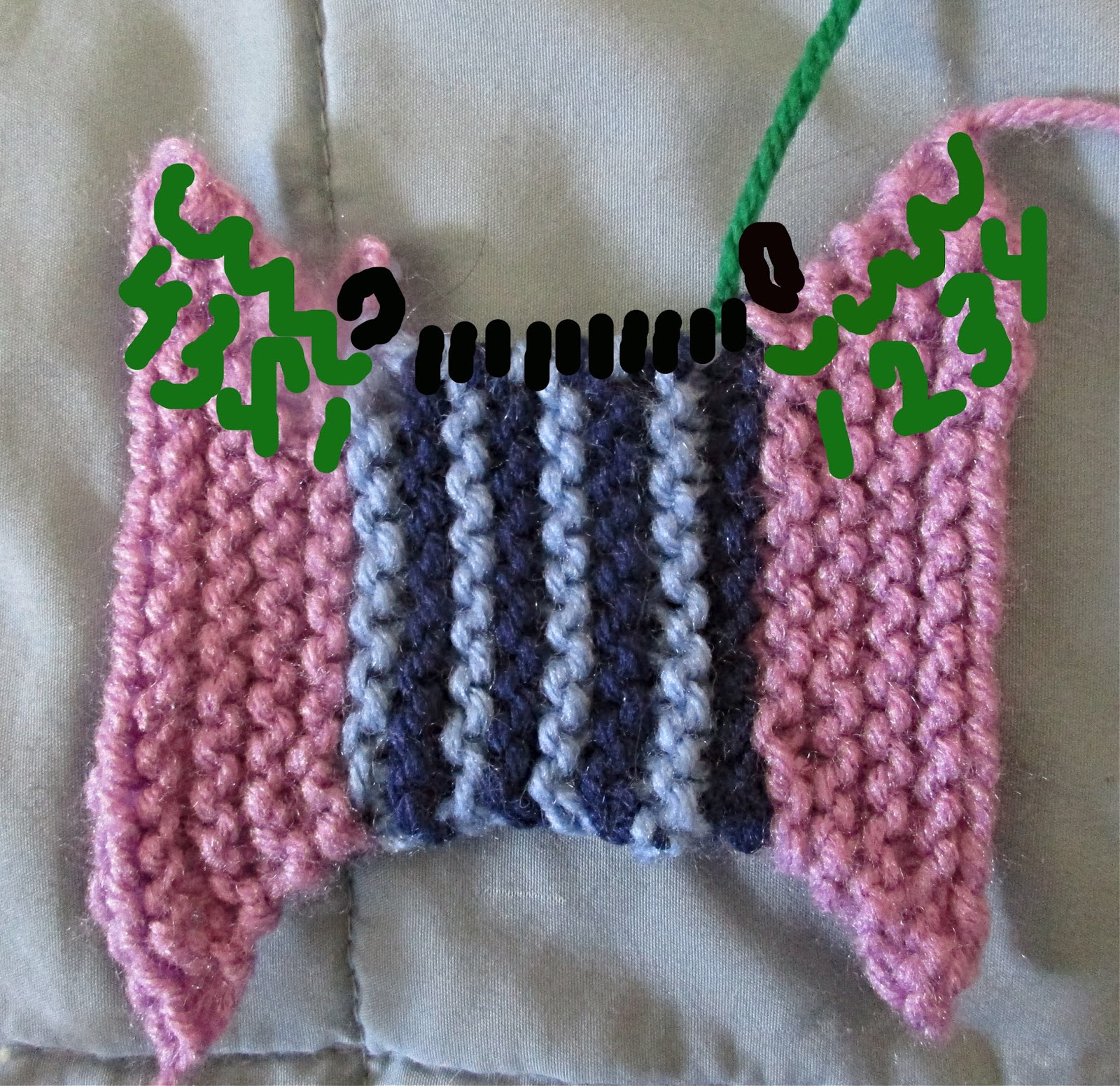 Если наборный ряд розовым цветом -считать первым рядом, то прибавлять по 1 петле с боков надо во всех нечётных изнаночных рядах.
