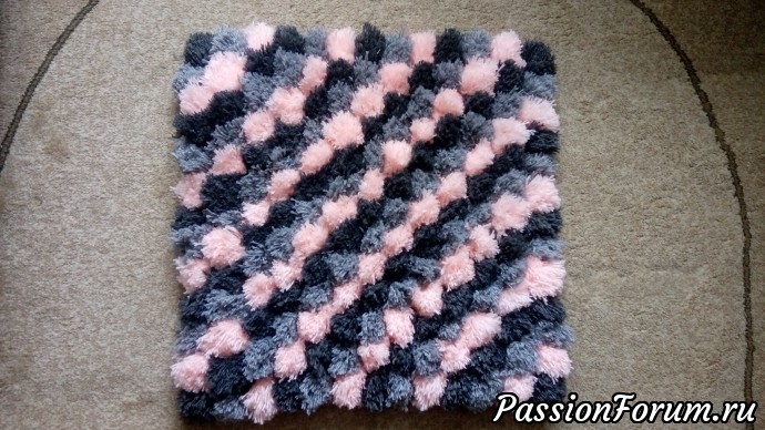 На днях закончила прикроватный коврик из помпонов. Мило получилось.