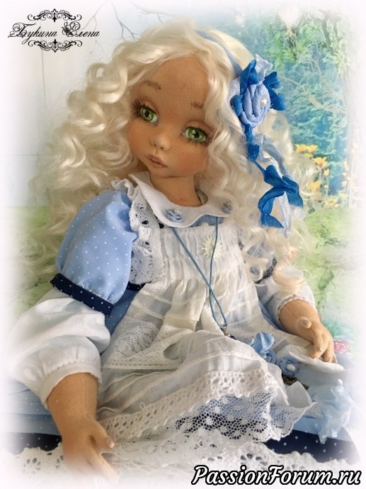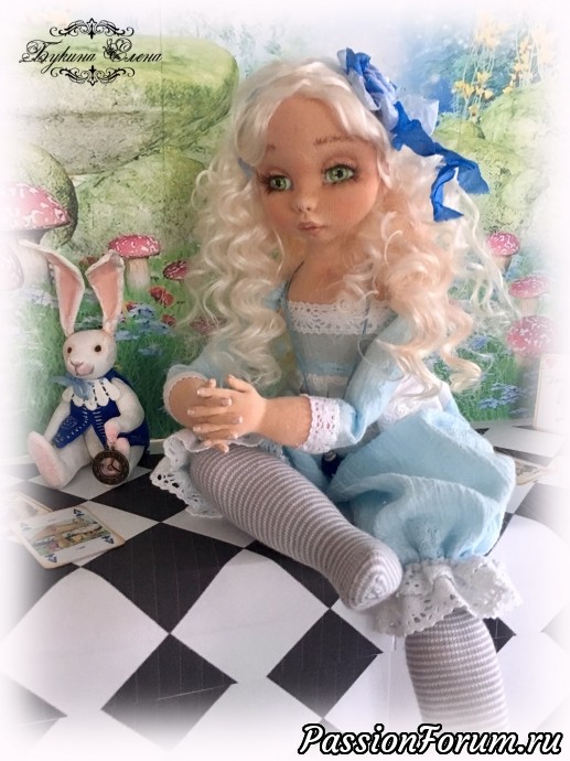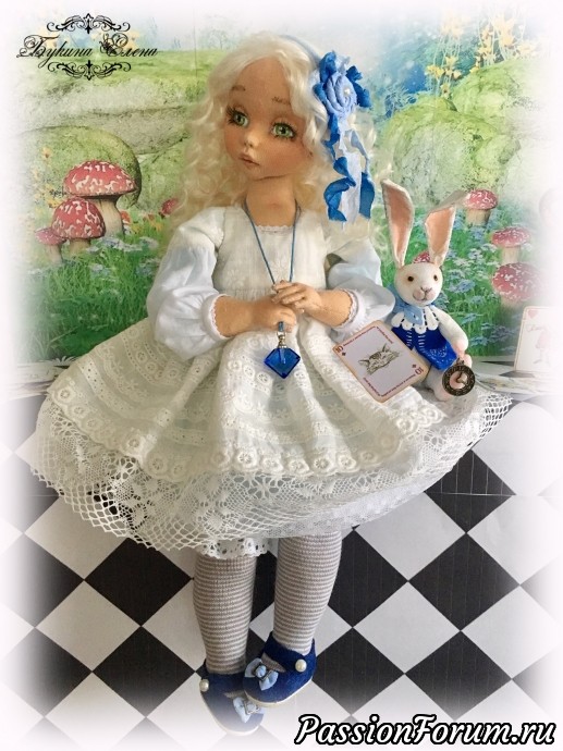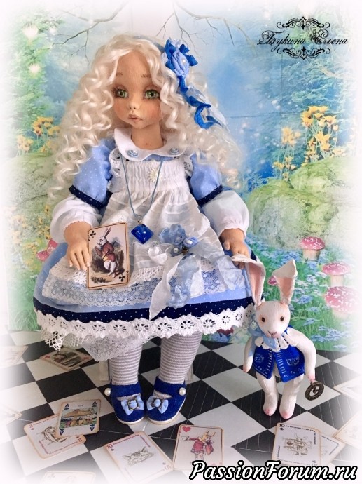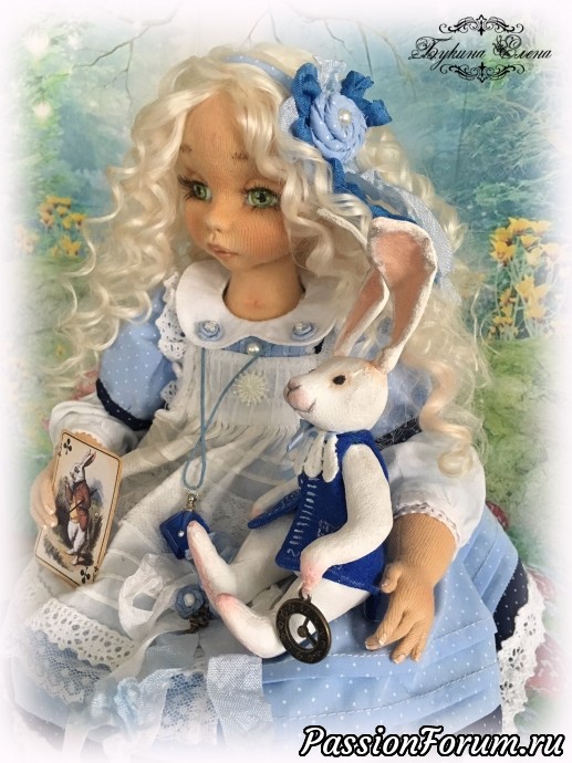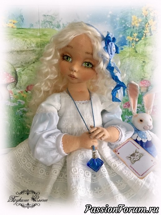 Наконец и у меня появилась Алиса из страны чудес. Коллекционная текстильная кукла. Малышка сшита из хлопка, обтянута трикотажем. Личико у куколки объёмное. Алиса вся подвижная. Головушка крутится и наклоняется. Ручки и ножки крепятся, как у будуарных кукол или куклы-болтушки. Малышка стоять не хочет, зато она умеет красиво сидеть и мило складывать ручки. Пальчики на ручках гнутся, есть маникюр. Волосы козочки натуральные, очень мягкие, можно аккуратно менять прическу, выпрямлять, завить. У малышки вся одежда съёмная, кроме комбинезона. Одежка сшита из хлопка, батиста, украшена кружевом, шебби лентами. Ботиночки сшиты из натуральной итальянской замши… Ну и как же Алиса без кролика с часами и карт. А помните флакон "выпей меня" , как в сказке? Выпила Алиса и стала маленькой. Такой у моей малышки тоже есть. В него можно добавить ароматическое масло. Рост Малышки 39 см.