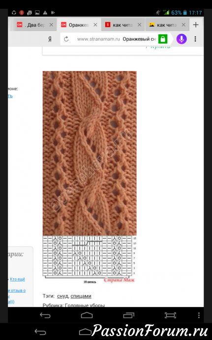 Очень давно не связала спицами. Вот решила связать снуд, в два оборота. Рисунок долго выбирала. Нашла на сайте "Страна мам".