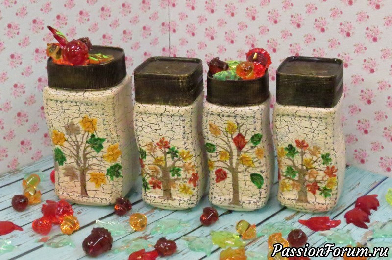 Двухшаговый кракелюр, декупаж салфеткой, крышки тонировала золотом.Листья выделила 3-D гелем и контуром, по граням также контуром поставила точки.Украшения на крышках «леденцовые желуди» и листья