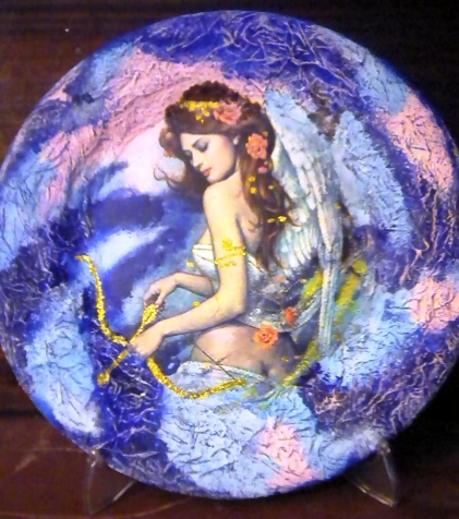 Две большие плоские тарелки мне подарили на день рожденья чтобы я что нибудь сотварила этакое. Используя мастер клас Ирины Налетовой у меня получились такие вот тарелочки. Желающих их приватизировать было хоть отбавляй.НО ведь тарелки то мне подарили, посему ангелочки остались обитать у меня. После этого мастер класса я просто заболела этим художником. Имя его Карл Банг.Китаец по происхождению. Он пишет потрясающих девушек из разных культур и народностей. Задайте в любом поисковике его имя и не пожалеете когда увидите его картины.