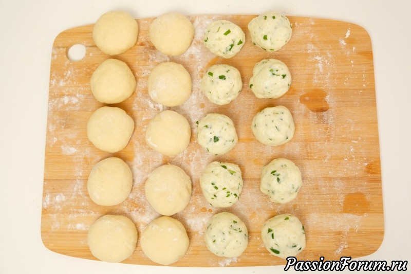 3.Тесто разделить на 10 равных частей. Смачивая руки холодной водой, также разделить и начинку.