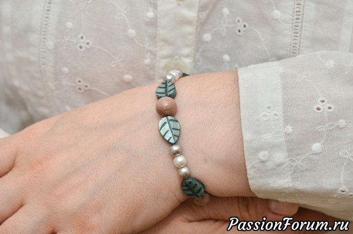Материалы: перламутр (листочек, белые и серебристые шарики), самоцвет(шарик), немецкое ювелирное стекло с глазурованным бочком.