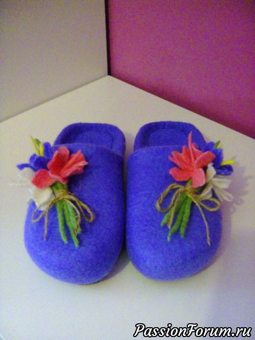 Здравствуйте, девочки! В предыдущем топике я вам показала свои первые тапочки, теперь покажу десятые. Первый десяток закрыт! Это так же значимые для меня тапочки тем, что это мой второй заказ и сделать его надо было в определенные сроки, 3 - 4 дня. Это была для меня проверка, потому что до этого я не знала точно сколько времени занимает у меня работа над тапочками, я работала в расслабленном состоянии: подошла смочила, потерла, оставила отдыхать. Сама в интернет искать декор, вдохновляться, посмотреть кто что выложил на любимом форуме, а вдруг идейку кто подкинет. А тут, бац, заказ, срочный, да ещё в подарок! Но не зря я на диване с планшетиком валялась, картинки с тапочками рассматривала. Вот они, всё сраслось и цвет шерстки заказчице понравился и декор (правда сначала она была нацелена на ромашки, моя предыдущая работа, попозже покажу) и тапочки для подошвы из ФП , нужного 38 размера у меня оказались в наличии. Заказ поступил в понедельник в 9 вечера. Во вторник в 12 ч (я птичка поздняя, сова наверное) приступила к работе.