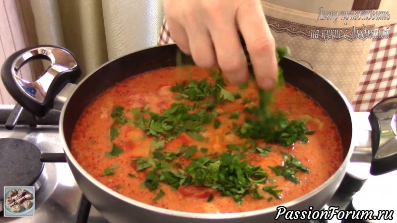 6. В конце приготовления добавляю большую горсть порезанной петрушки. Все перемешиваю и плиту выключаю. Куриный паприкаш готов.
