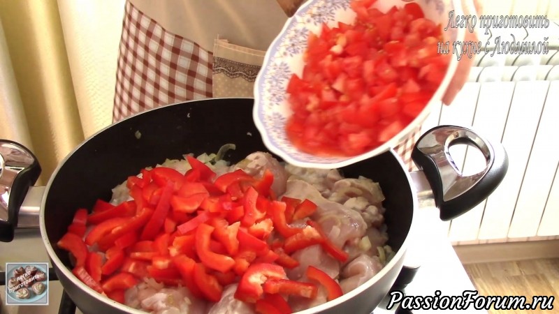 2. Затем кладу в сковороду порезанное на крупные кусочки куриное филе, порезанный некрупной соломкой сладкий болгарский перец, порезанные мелким кубиком помидоры, добавляю паприку, все перемешиваю, накрываю сковороду крышкой и тушу все на небольшом огне до готовности мяса.