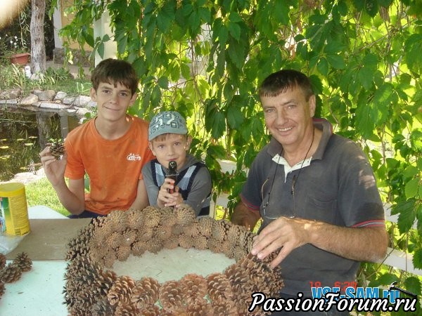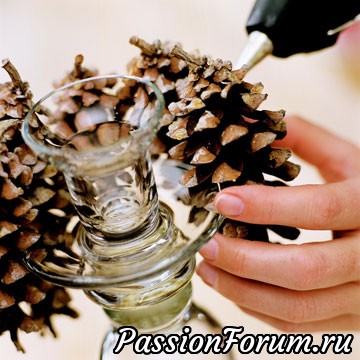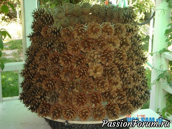 Далее на круг по периметру клеем шишки термоклеевым пистолетом. Второй и последующее ряды шишек клеются немного со смещением шишек к центру круга, как конус.