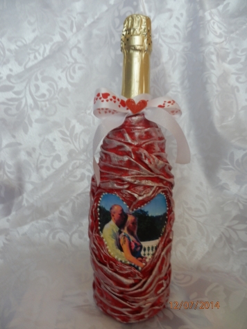 Ну а красной бутылкой вы меня просто удивили! Никогда бы не подумала, что с помощью х/б ткани можно навоять такую красоту! Но лично мне кажется, что на свадьбу больше подходит что то нежное, навроде бутылочки с голубками. А красная больше подходит на годовщину свадьбы или на 14 февраля. Но это моё субъективное мнение.