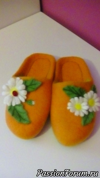 Добрый день, девочки! Хочу показать вам первые тапочки, сделанные на заказ. Заказчица была не притязательна, полностью доверилась моему вкусу. Ну а нам, то и надо! Рисунки по сухому уже делала, нужно попробовать объёмный декор. А на что я давно любовалась - на ромашки! Несколько месяцев смотрела на оранжевые тапочки с ромашками. Оранжевая шерстка в наличии, 100 гр, в компаньон к ней светло-зеленая и поехали! Шерсть Троицкая, 160 гр на 36 размер, длина шаблона 38 см. На этом шаблоне я делаю тапочки с 36 по 40 размер, регулирую весом шерсти. Работала без напряга, торопиться было не куда. Первый раз делала цветы, МК не смотрела, делала как в голову взбредёт, один бутончик набила по сухому. Подошва от тапочек из ФП, жалко на тот момент у меня не было цветных ниток и подошвы пришлось пришивать - черными, это несколько подпортило внешний вид. Заказчица осталась довольна. Свои работы я показываю в Вайбере знакомым, хотите не хотите - смотрите! Ромашки сработали, на них поступил новый заказ, над которым я сейчас и работаю, правда тапочки в другом цвете и пока не знаю, как на них будут смотреться ромашки.