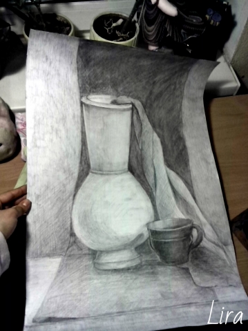 Здравствуйте!)Представляювам свою недавнюю работу - натюрморт с натуры,графика. Рисовала окло месяца. Каждый элемент сделано тонким штришком.С помощью разной мягкости карандашей,у меня начинает удаваться передавать нужные оттенки и тени. Материалы - бумага для черчения,простые карандаши.Формат - а2(половина ватмана).Сделано в художественной школе)