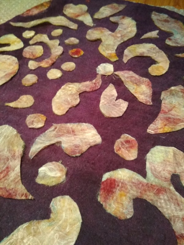 Добрый день, девочки! Хочу поделиться с вами своим экспериментом, скорее это сразу несколько экспериментов в одном изделии. Во-первых, это первые мои варежки (точнее одна варежка). Второе, это то что я опять решила испытать шерсть Камтекс (полутонкая). Я конечно понимаю, что опытные мастерицы валяют из тонкого мериноса, но у меня есть немного тонкой шерсти и я побоялась её испортить. Третье, украсить решила фигурами из вискозной бумаги. Наташа выкладывала пост с МК Нины Демидовой. Что-то подобное я решила сотворить. Ну, я конечно как всегда, просмотрю, почитаю и пойду сделаю по своему. Сначала я подготовила вискозу, выложила на плёнку несколько оттенков вискозы, смочила и через сеточку натерла хозяйственным мылом. Сняла сетку и прямо на пленке повесила на батарею. Сама занялась раскладкой шерсти. На варежку у меня ушло 18 гр. Раскладка поперечными рядами под углом 45 градусов, в одну и другую стороны (как её точно обозвать, я не знаю, уже запуталась), извините. Сверху облачками выложила красную вискозу.