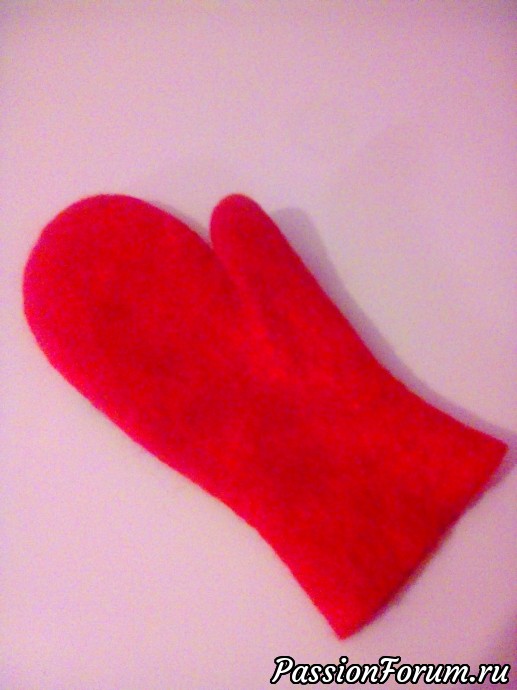 За это время вискозная бумага была готова, конечно она у меня получилась очень тоненькая, ну да ладно, это же только эксперимент. С пленки снялась хорошо. Вырезала я из неё разные детальки и разложила на варежку, как смогла, с художественным вкусом у меня напряг, а идти где-то подсматривать не захотелось. Поэтому получилось, как получилось. По вискозному декору я прошлась ВШМ, благо в отличие от другого инвентаря, она у меня есть, хотя пользуюсь ей мало. А дальше валяла, притирала с двух сторон, мяла, месила, терла и притирала на руке. Всё замечательно посадила на свою руку и пальчик улёгся сам по себе, не торчит в сторону. Низ немного подрезала, подравнивала. А так вроде получилось, не шедевр конечно, но можно к ней и пару свалять, чего же она одинокая будет (скажу по секрету, вторую я уже разложила). Это я рассказала три момента эксперимента, есть ещё. Слабонервных прошу не читать. Знаю, меня спросят какой КУ. Нет КУ, не расчитываю не КУ, не ку-ку. Шаблон нарисовала от балды. Обрисовала руку, палец под углом приблизительно 45 градусов, немного увеличила на свободу облегания и потом на глаз прибавила на усадку. Вот это и были 4 и 5 моменты эксперимента, пальчик и величина шаблона. Ляжет ли пальчик и войду ли я в размер. На мой взгляд, я справилась, хотя и не очень старалась. На будущее я учту все моменты, которые нужно подработать и буду улучшать качество. Не знаю, буду ли ещё валять варежки, не ношу их. Но для других изделий этот опыт может быть полезен. Ни кого не призываю так безалаберно относится к КУ, но я работаю так, даже на пальто не рассчитывала и образцы не валяла, шерсти было в обрез, даже на карманы не хватило. Может интуиция у меня хорошая, а может просто дуракам везёт, пока всё срасталось. Извините за долгий опус, кто дочитал. Приглашаю поглядеть на мою одинокую рукавичку. А пока - пока!