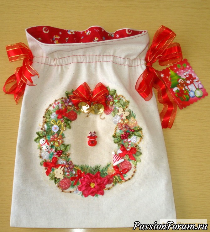 Выполнены из двунитки, подкладка из красивой хлопковой ткани. Декорированы новогодним рисунком, вышитым лентами, мулине. Мешочки украшены бусинами, бисером, колокольчиками, разноцветными контурами. Завязываются яркими ленточками.