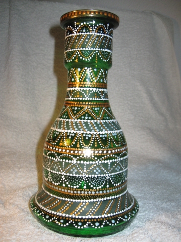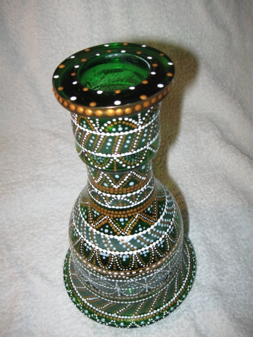 Бежала я как-то по делам, вижу кучка шпермюльная (Sperrmüll (нем.) - вынесенный на улицу перед домом хлам для централизованного сбора и утилизации), в одном из мебельных ящиков лежит себе тихохонько ваза. Для точечной росписи подходит как ни что лучше, полосатенькая уже, цвет мой любимый, зелененький. Смотрите, что вышло. Узор примитивный, точки неровные, нетвердые. Но мне понравилось ее оформлять. Критика, замечания и советы принимаются.