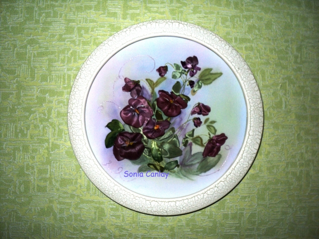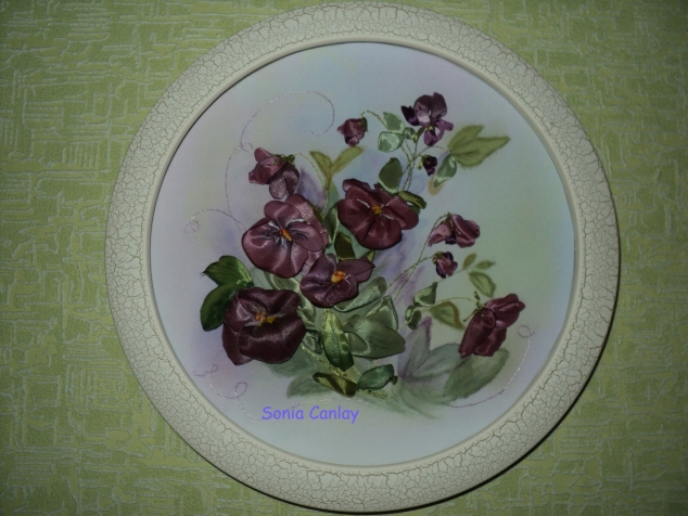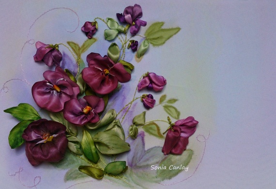 эти нежнейшие анютины глазки теперь - "наташины" глазки))) Вышивка на шёлковой ткани ленточками из натурального шёлка... тонировала рукодельница сама и фон и цветочки.