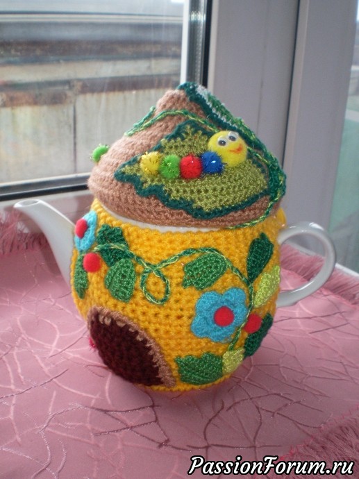 Обещала рассказать как вяжу одежку для чайника - выполняю. На этот раз принесли сам чайник и 2 моточка пряжи (коричневый цвет не люблю, но сразу возникла ассоциация с грибочком.) Начинаю вязать с донышка по кругу. Делаю его чуть больше по размеру, чем само дно, обвязываю рачьим шагом, переворачиваю работу на лицо и начинаю полустолбики перед рядом рачьего шага. По форме самого чайничка делаю прибавки. Отвестие для носика - по его форме. (тоже заканчиваю рачьим шагом). Чтобы одежка плотно прилегала, застежка на пуговку. "Шляпку" грибочка немного набила синтепухом. Потом началось самое интересное: листики, цветочки, дверца, заборчик, и...куда же деться от моих любимых ползявок (приклеила в память о своей коллекции, тем более, что заказчица - помощница в пополнении коллекции). Как-то так. Спасибо всем заглянувшим! Если что не очень понятно - спрашивайте.