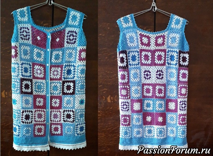 Выродилось по 42 квадратика на перед и спинку, кое-как догадалась связать 4 треугольника