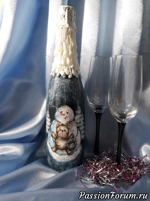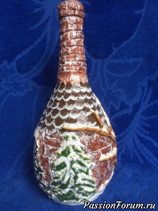 Материалы: бутылка, шпатлёвка, глина самодельная, паста, краски, блёстки.