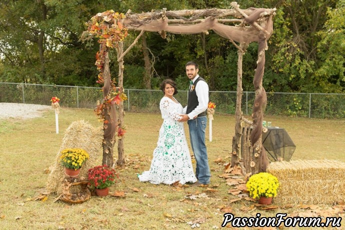 И тут невесте пришла в голову замечательная мысль: а почему бы не связать себе свадебное платье крючком? Вооружившись белой пряжей за 70 долларов и готовым зелёным платьем под низ за 100 долларов Эбби потратила 8 месяцев на то, чтобы связать себе платье своей мечты — и оно получилось в точности таким же, каким она себе его представляла.